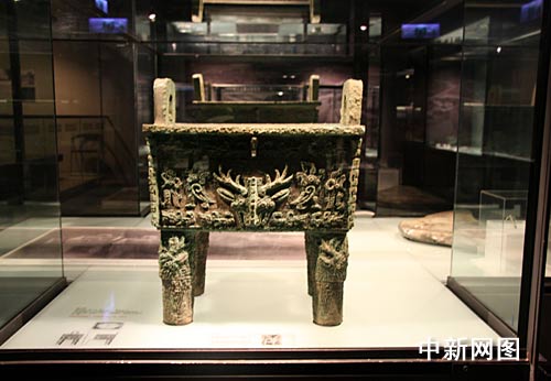 鹿方鼎为中国商代晚期青铜器,通高73.2厘米,口长64.4厘米,宽45.6厘米。1935年河南安阳武官北地1004号墓出土,此器长方形体,深腹平底,圆柱形空足。口下饰一周龙纹,四面中央饰牛角兽面,两侧立鸟,足饰兽面纹,三角纹。此鼎出自商王陵,底部有牛纹。现收藏于台北“中央研究院”历史语言研究所。陈立宇 摄