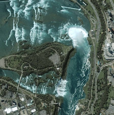 尼亚加拉瀑布:本图由IKONOS摄于2004年8月2日,尼亚加拉大瀑布中蓝绿色的水流落差达51米,蔚为壮观。瀑布位于加拿大境内,成马蹄形,每秒水流量超过2百万升,是世界上最大的瀑布之一。