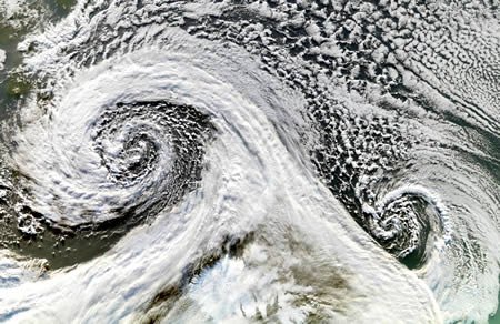 双气旋图:图中两大气旋于2006年11月相继形成于冰岛以南,本图由NASA地球卫星MODIS成象仪摄于11月20日,图中南为上。