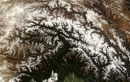 青藏高原冬季卫星图:NASA土地卫星上高清代分光成象仪(MODIS)拍摄到了青藏高原的真彩图片,可以看到被称为"世界屋脊"的高原上,山顶的点点积雪和部分结冰的湖面。