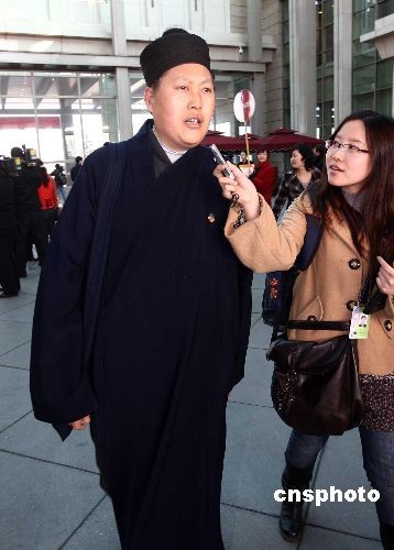 3月1日,赴北京参加“两会”的全国政协委员、四川省道教协会会长、青城山天师洞道观道长唐诚,刚一抵达北京机场就被记者追访。2OO9年全国“两会”即将开幕,代表、委员们已开始陆续抵京报到。中新社发 杜洋 摄