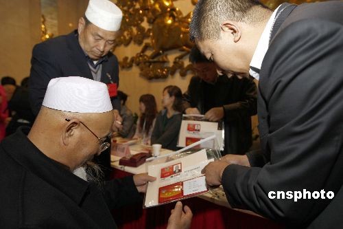 全国“两会”即将开幕,代表、委员们3月1日陆续抵京报到。图为甘肃省政协副主席、天水市伊斯兰教协会会长马国瑜(左)在北京驻地领取证件。中新社发 盛佳鹏 摄
