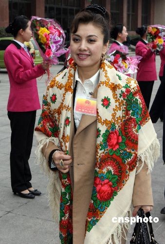 3月2日下午,出席十一届全国人大二次会议的新疆维吾尔自治区代表团抵达北京驻地京西宾馆,全国人大代表、维吾尔族舞蹈家迪丽娜尔·阿不都拉受到工作人员的欢迎。中新社发 任晨鸣 摄