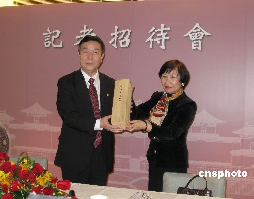 3月2日下午,台北故宫博物院与北京故宫博物院代表在台北故宫博物院,就2月15日双方在北京达成的共识举行进一步会谈,并在会后召开记者会,发表落实合作交流方案,双方同意在不涉及名称载示及法令之前提下,进行8项实质性合作。根据落实方案,今年故宫两院将举办首届学术研讨会并每年于7月至9月互访、互赠新出版品,互派人员驻访2至3个月,协商互设商品柜台,台北故宫今年举办的雍正特展向北京故宫借展27组(37件)文物等。图为台北故宫博物院院长周功鑫(右)向北京故宫博物院院长郑欣淼(左)赠送唐代怀素《自叙帖》的高仿真复制品。中新社发 路梅 摄