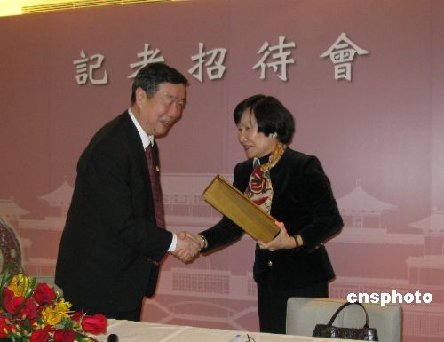图为北京故宫博物院院长郑欣淼(左)向台北故宫博物院院长周功鑫(右)赠送宋代赵昌《写生蛱蝶图》的高仿复制品。中新社发 路梅 摄