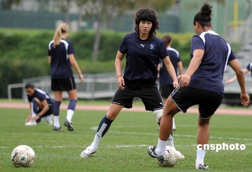 加盟美国洛杉矶太阳队的中国女足队员韩端三月二日与队友一起参加新赛季开赛前的首次正式集训。韩端是中国国家女子足球队的主力前锋,曾征战过两届奥运会和女足世界杯等大赛。韩端加盟的洛杉矶太阳队拥有一批世界顶级水平的女足球员,包括世界“足球小姐”巴西前锋玛塔。中新社发 张炜 摄