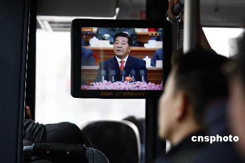 3月3日,全国政协十一届二次会议在北京人民大会堂开幕,北京市民在公交车上通过移动电视收看相关报道。中新社发 郑雄增 摄