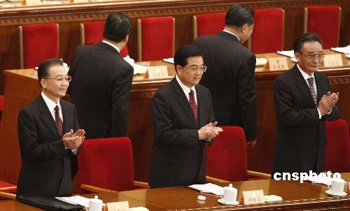 3月3日,全国政协十一届二次会议在北京人民大会堂开幕。国家主席胡锦涛、全国人大常委会委员长吴邦国、国务院总理温家宝出席开幕式。中新社发 盛佳鹏 摄