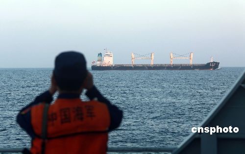 中国海军护航编队“海口”号导弹驱逐舰完成接护遭海盗袭击商船“雁荡海”号任务。图为2月26日,接护途中护航官兵对商船进行了望、警戒。2月25日,“雁荡海”号由于供货期限原因未能参加护航,在亚丁湾海域航行途中遭遇海盗袭击。中新社发 孙自法 摄