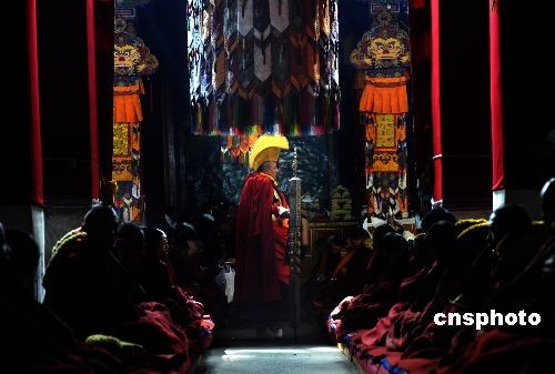 3月4日,中国藏历新年正月初八,西藏拉萨哲蚌寺,“铁棒喇嘛”在措钦大殿举行的传昭大法会上。“铁棒喇嘛”藏名:“格贵”,负责维持僧团清规戒律的寺院执事,历史上藏传佛教各大寺院的纠察僧官巡视僧纪时,常随身携带铁杖,故有“铁棒喇嘛”之俗称。中新社发 廖攀 摄