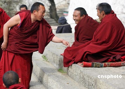 3月4日,藏历新年正月初八,拉萨色拉寺举行传昭大法会,僧人们会进行传统的辩经、祈愿、颂经等佛事活动。每年的传昭大法会从藏历正月初八开始,持续到藏历正月十五。图为在色拉寺大殿前举行的僧人辩经活动。中新社发 刘震 摄