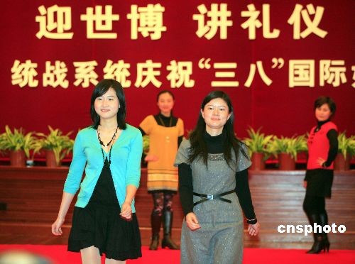 3月4日,上海统战系统女公务员欢聚一堂,穿戴自己最靓丽的时装,登台展示礼仪和风采。据悉,这是该机关举行“迎世博、讲礼仪、展风采、庆祝三八妇女节”活动之一。中新社发 潘索菲 摄