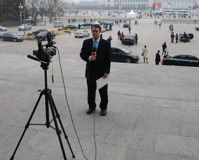 一名外籍记者在大会堂门前进行现场采访,与众不同的是,他一人就完成了从录制到现场播报的采访全过程,他从容地支起摄像机,开始了滔滔不绝的现场播报。