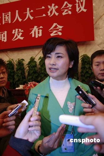 2009年3月4日,吴小莉参加十一届全国人大二次会议新闻发布会时接受采访,针对“香港如何应对金融危机”这一话题回答了记者提问。中新社发 金立冬 摄