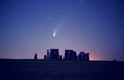 本图是1997年海尔-波普彗星飞越巨石阵上空时被摄影师拍下来的照片。西蒙斯认为,这幅图也许可以将人类的现在与过去和将来联系到一起。该彗星上次出现于巨石阵上空大约是4000千年前。当它再一次回来时,预计是在2000年后。英国巨石阵大约建于公元前3100年。关于巨石阵的用途,至今颇具争议。有人认为这是一种典型的古代葬礼或祭祀遗址,同时也有人认为它还是一种天文观测站。一圈高大的石块与一些竖立的巨石形成了一个半开口形状的阵列。开口方向恰好指向夏至日太阳升起的方向。矗立在英国南部索尔兹伯里平原上的巨石阵,是英国最重要、最神秘的历史遗迹之一。多数考古学家认为,它既是天文观测站,也是古代宗教遗迹。
