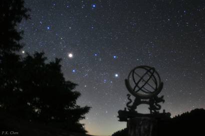 每当夜晚,你走出房间可能会在夜空中看到一颗非常明亮、略带微红色的物体,那就是火星。在本图中,御夫座群星中间的那颗最大亮点就是火星,恰好与夜幕下的中国浑天仪遥相呼应。浑天仪是清康熙年间钦天监官员南怀仁等制造,并于1669年进呈朝廷的。仪器由三层环架组合、上圆下方的造型,是中国传统浑天仪的表现形式,但在刻度和设计原理上却采用了西方法度及5世纪托勒密的地心说,可见这是中西科技融合的作品。由于这件浑天仪能够科学地演示日月交食之成因,一经进入宫廷使用,对于康熙朝再度应用西洋历法、改进中国测天仪器等都起了积极的作用。