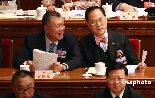 图:曾荫权、何厚铧在人大主席台上交谈——中新网