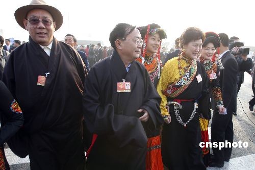 3月5日上午,十一届全国人大二次会议在北京人民大会堂开幕。来自四川的全国人大代表甲登·洛绒向巴、李昌平等一同步入会场。中新社发 盛佳鹏 摄