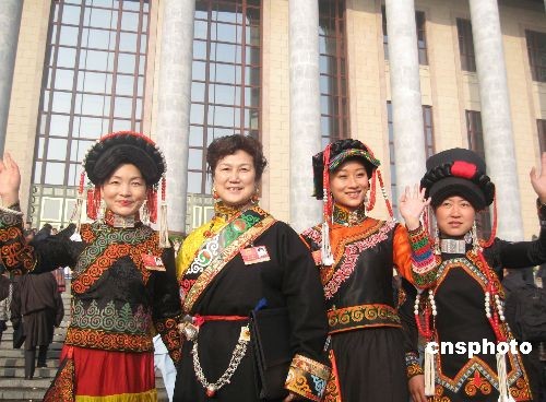 5日上午9时,十一届全国人大二次会议在北京开幕。图为身着民族服装出席大会的四川女代表。中新社发 肖青 摄