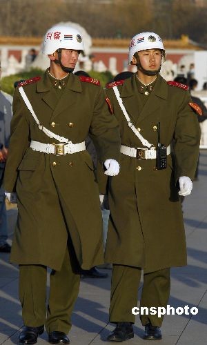 3月5日,中国军队纠察士兵在北京天安门广场检查军容军纪。中新社发 郑雄增 摄
