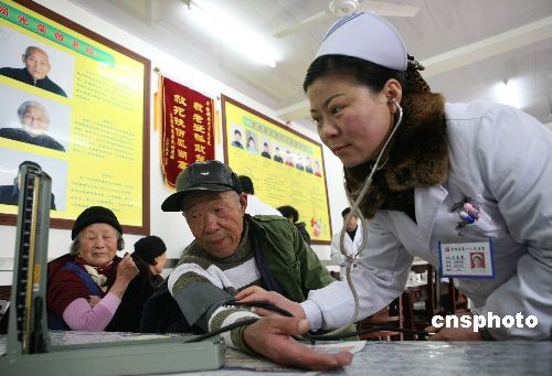 3月5日,安徽蒙城县第一人民医院的青年志愿者携带有关诊疗器械,来到县民政局光荣敬老院义务为这里的老人们测量血压、检查身体,并接受老年健康咨询,以实际行动传承雷锋精神。中新社发 胡卫国 摄