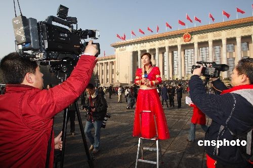 3月5日,十一届全国人大二次会议在北京人民大会堂隆重举行。大会吸引了近4000名中外记者前来采访报道。图为内蒙古电视台的记者在大会堂外做现场报道。中新社发 李松 摄