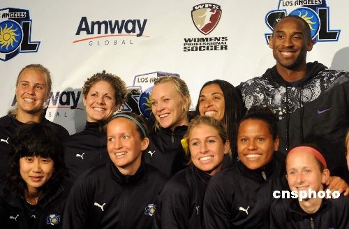 NBA著名球星科比·布莱恩特在洛杉矶欢迎加盟洛杉矶太阳队(美国女子足球职业联盟球队)的巴西球星玛塔(后排右二)、中国球员韩端(前左一)等外籍球员,并与太阳队队员合影。中新社发 张炜 摄