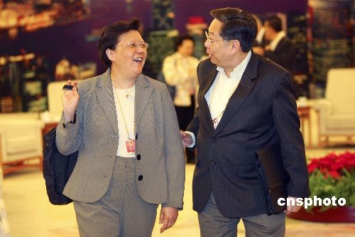 3月6日,十一届全国人大二次会议举行小组会,审议政府工作报告。图为全国人大代表范徐丽泰在参会时与其他代表交谈。中新社发 盛佳鹏 摄