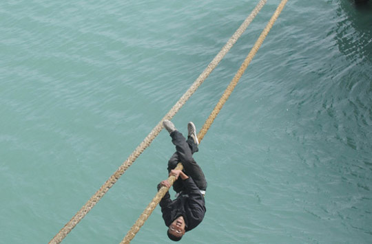 3月5日,在直布罗陀海峡的丹吉尔港,一名摩洛哥男子试图通过绳索爬向一只驶向西班牙的船只,最终被安全人员逮捕。