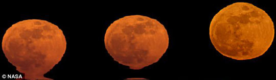 月亮的“融化”。一位名叫约翰·斯特森的美国业余摄影师拍摄到一组月亮蜃景的壮观照片。这种罕见的天文现象是因不同温度的层层空气使月光弯曲形成的。