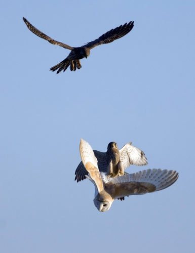 猛禽“空战”。图为一只谷仓猫头鹰在白天觅食时遭到两只茶隼的伏击的照片。