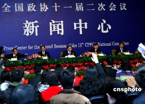 3月7日上午,全国政协十一届二次会议就“大学生就业问题”举行记者会,全国政协委员王超斌、张亚忠、蔡继明、宗立成、金正新回答记者提问。他们普遍认为,在国家出台具体的政策扶持大学就业的同时,大学生自身改变就业观念也很重要,从正面看“大学生卖猪肉”现象具有积极意义。中新社发 宋吉河 摄