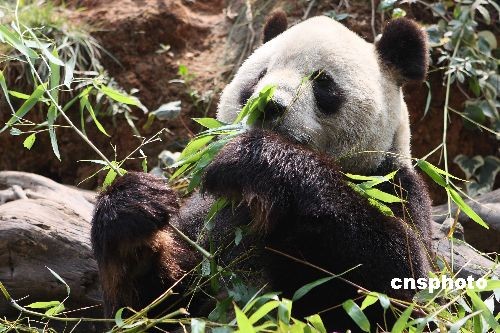 3月7日,一只大熊猫在云南野生动物园悠闲的享用美味竹叶。在“5·12汶川大地震”中,地处四川卧龙的中国保护大熊猫研究中心遭受重创。为了确保国宝大熊猫的安全,在地震发生之后,卧龙基地3只大熊猫被送到云南野生动物园暂养。日前,中国保护大熊猫研究中心专程来到昆明看望3只大熊猫。据悉,3只熊猫宝宝目前健康状况十分良好。中新社发 保旭 摄
