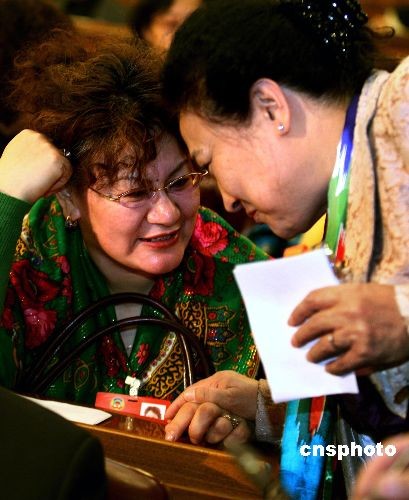 3月7日下午,全国政协十一届二次会议举行第二次全体会议,提前到会的两位少数民族委员说起“私房话”。中新社发 宋吉河 摄