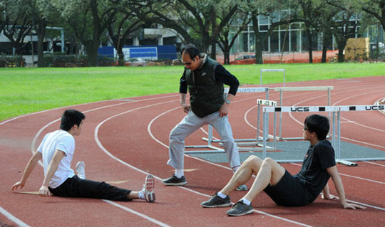 3月6日,刘翔在休斯敦莱斯大学田径场进行了体能和跨栏技能训练。当日,刘翔结束了在美国休斯敦的康复训练,于3月7日启程回国。图为刘翔在聆听教练孙海平的指导。