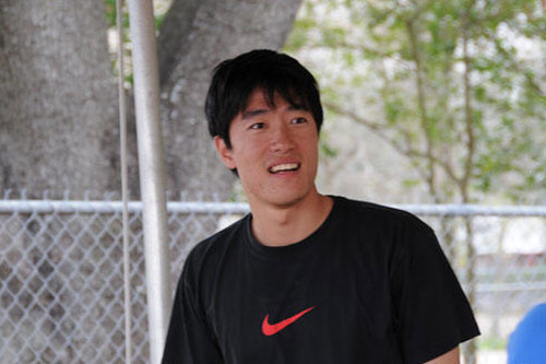 刘翔在休斯敦莱斯大学田径场进行体能和跨栏技能训练中面露笑容。