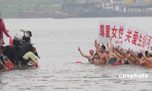 三月八日国际妇女节,广西南宁市虽然天气寒冷,一群冬泳爱好者却以游邕江方式庆祝三八节。中新社发 蒋雪林 摄