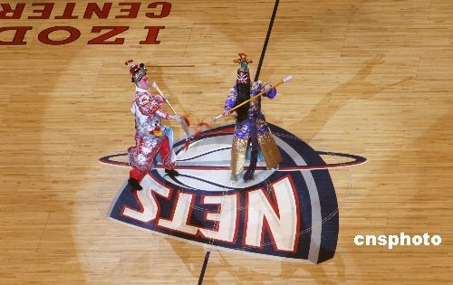 当地时间3月8日晚,美国大纽约地区“2009中华之夜”晚会在NBA新泽西网队主场举行,NBA赛场吹出一阵“中国风”。在新泽西篮网对阵纽约尼克斯的赛间休息时,传统京剧表演令许多美国球迷倍感新奇。中新社发 魏晞 摄
