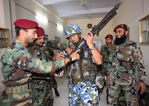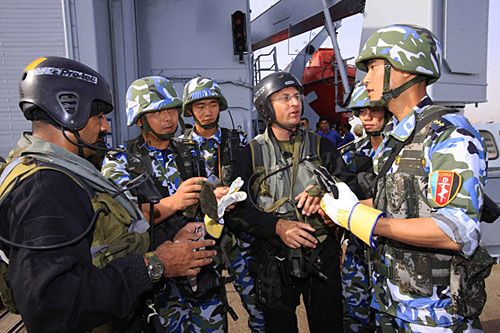 中国海军特战队员(中)参加“和平—09”多国海上联合军演时与巴基斯坦海军特战队员交流。