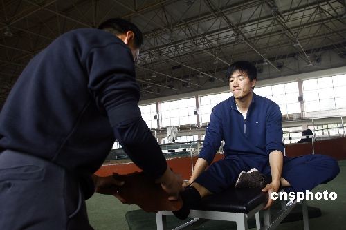 3月10日上午, 刘翔在上海莘庄基地开始进行正式训练,在训练间隙,孙海平教练用一块海绵来帮助训练刘翔右脚的灵敏性。孙海平教练表示:由于刘翔的伤势刚刚恢复,右脚踝关节力量还不够,用海绵训练是为了增加刘翔右脚踝的灵活性。”中新社发 汤彦俊 摄
