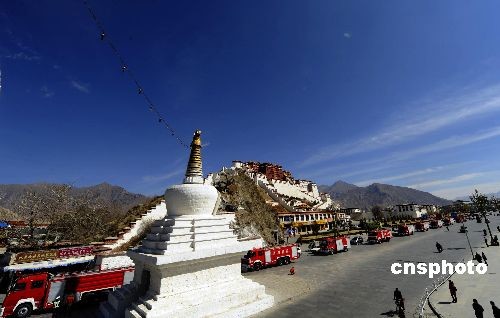 3月10日,西藏公安消防特种装备车辆驶过布达拉宫广场。当日,西藏公安消防特种装备车辆服役仪式在拉萨市举行,26辆消防车辆在市区主要街道进行拉动演练。中新社发 廖攀 摄