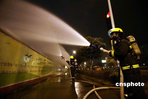 图为消防官兵沿途对工地进行稀释。中新社发 袁帆 摄