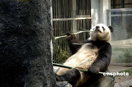 三月十二日,去年从四川地震灾区转移到福州的大熊猫在福州熊猫世界里,躺在明媚阳光下,悠闲地吃着竹子。中新社发 王东明 摄