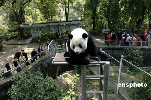 三月十二日,台湾游客正在福州熊猫世界观看熊猫。大熊猫“团团”、“圆圆”在台湾产生的效应,致使现在来福州观看熊猫的台湾游客比以前增加三倍以上。中新社发 王东明 摄