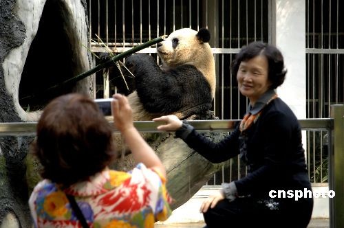 三月十二日,台湾游客在福州熊猫世界与熊猫近距离合影留念。大熊猫“团团”、“圆圆”在台湾产生的效应,致使现在来福州观看熊猫的台湾游客比以前增加三倍以上。中新社发 王东明 摄