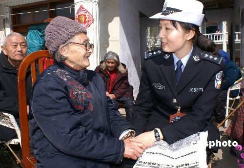 为传达贯彻全国“两会”精神,3月10日,河南商丘公安局交警支队一大队的警花们带着宣传资料来到辖区第一老年公寓,以多种形式向老人宣传全国“两会”精神。图为警花和老人在聊天。中新社发 白项林 摄