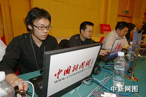 3月12日下午,十一届全国人大二次会议新闻中心举行“文化市场与文化产业发展”专题采访,中新网记者现场工作。中新社发 杜洋 摄