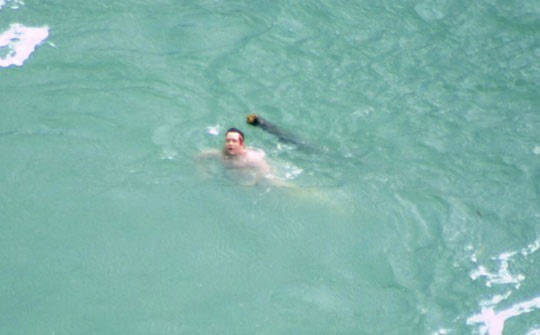 这名男子竟然拒绝接受救援人员的救助,继续向中央游去。