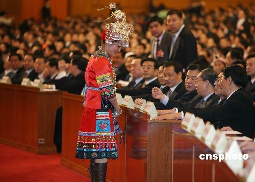 3月13日上午,第十一届全国人民代表大会第二次会议在北京人民大会堂举行闭幕会。会前,来自重庆的苗族女代表李小燕逐一请坐在前排的各省省长们在纪念册上签名。中新社发 任晨鸣 摄