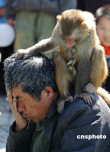 图:安徽巢湖街头耍猴人被猴耍(3)——中新网